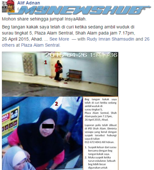 Adik kepada pemilik beg tangan yang dicuri itu, Alif Adnan, telah memuat naik gambar-gambar yang dirakam CCTV di laman sosial Facebook dan meminta bantuan orang ramai untuk mengenal pasti dan mengesan suspek.